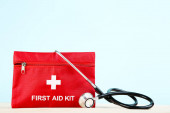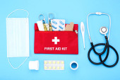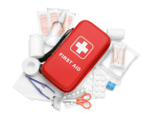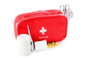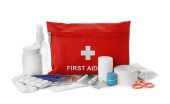 Zestaw pierwszej pomocy z zaopatrzeniem medycznym izolowanym na białym tle