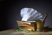 Kapelusz szefa kuchni z książkami kucharskimi i mąką w łyżce na drewnianym tle