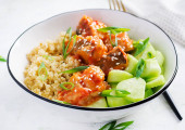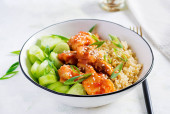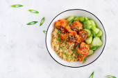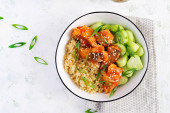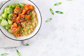 Zdjęcie "Filet rybny gotowany w sosie pomidorowym z bulwą i ogórkiem na talerzu na jasnym tle. Idea zdrowego odżywiania. Łatwe gotowanie." może być wykorzystywane do celów osobistych i komercyjnych zgodnie z warunkami zakupionej licencji Royalty-free. Obraz jest dostępny do pobrania w jakości wysokiej rozdzielczości do 5760x3840.