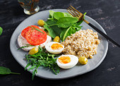 Owsianka śniadaniowa z grecką sałatką z pomidorów, ogórków, oliwek i jaj. Zdrowa zrównoważona żywność.