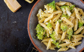 Sałatka wegańska. Makaron Fusilli z zielonym groszkiem i cebulą. Włoskie jedzenie. Widok góry. Układy płaskie.