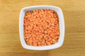 Surowa soczewica pomarańczowa w misce na drewnianym stole