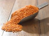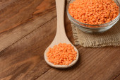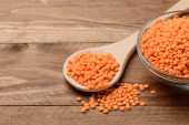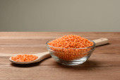 Surowa soczewica pomarańczowa w misce na drewnianym stole