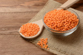 Surowa soczewica pomarańczowa w misce i łyżce na drewnianym stole