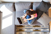 Szczęśliwa młoda kobieta siedzi na kanapie i korzysta z laptopa w domu.