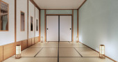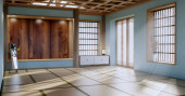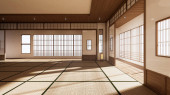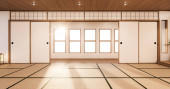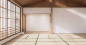 Wnętrze pustego pokoju do jogi z podłogą z maty tatami.