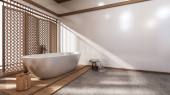 Zdjęcie "wanna w japońskiej łazience ma boczny basen design pokój jest przestronny i lekki w naturalnych kolorach. Renderowanie 3D" może być wykorzystywane do celów osobistych i komercyjnych zgodnie z warunkami zakupionej licencji Royalty-free. Obraz jest dostępny do pobrania w jakości wysokiej rozdzielczości do 5760x3840.