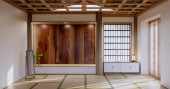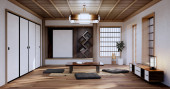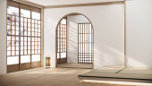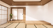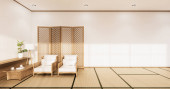 przegroda japoński na pokój tropikalne wnętrze z podłogą maty tatami i białą ścianą.3D rendering