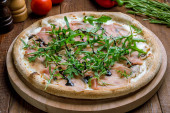 Zdjęcie "Pinsa z szynką parmeńską i grzybami, pizza rzymska." może być wykorzystywane do celów osobistych i komercyjnych zgodnie z warunkami zakupionej licencji Royalty-free. Obraz jest dostępny do pobrania w jakości wysokiej rozdzielczości do 5760x3840.