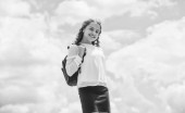 Zdjęcie "szczęśliwy kręcone dziewczyna trzymać plecak na tle nieba. Z powrotem do szkoły. szczęście z dzieciństwa. Mały dzieciak w słoneczny dzień. Wakacje. małe dziecko uśmiechnięte w wiosenną pogodę" może być wykorzystywane do celów osobistych i komercyjnych zgodnie z warunkami zakupionej licencji Royalty-free. Obraz jest dostępny do pobrania w jakości wysokiej rozdzielczości do 5760x3840.
