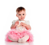 Zaskoczony maluch dziewczynka siedzi na białej podłodze