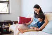 Zdjęcie "Zostań w domu, mama pracująca zdalnie na laptopie, opiekując się dzieckiem. Młoda matka na urlopie macierzyńskim próbuje być wolnym strzelcem przy biurku z małym dzieckiem. Zbliżenie, przestrzeń kopiowania, tło" może być wykorzystywane do celów osobistych i komercyjnych zgodnie z warunkami zakupionej licencji Royalty-free. Obraz jest dostępny do pobrania w jakości wysokiej rozdzielczości do 5760x3840.