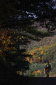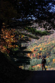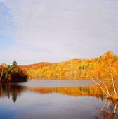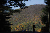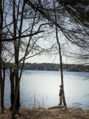 Sharon Ct, USA Jesienne liście i jesienne kolory oraz mężczyzna nad jeziorem.