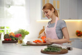 Zdjęcie "Młoda kobieta z warzywami i słoikami do marynaty przy stole w kuchni" może być wykorzystywane do celów osobistych i komercyjnych zgodnie z warunkami zakupionej licencji Royalty-free. Obraz jest dostępny do pobrania w jakości wysokiej rozdzielczości do 5760x3840.