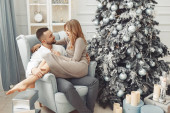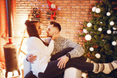 Elegancka para stojąca w domu w pobliżu choinki