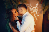 Elegancka para siedzi z girlandą w domu na łóżku