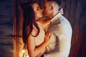 Elegancka para siedzi z girlandą w domu na łóżku