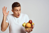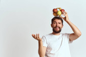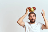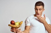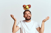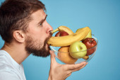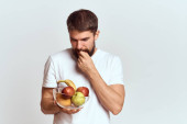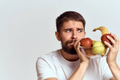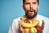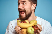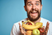 ciemne tło przystojny mężczyzna z broda gospodarstwa świeże owoce i styl życia przezroczysty kubek
