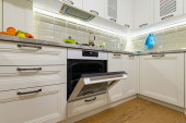 Zdjęcie "Nowoczesne klasyczne białe wnętrze kuchni" może być wykorzystywane do celów osobistych i komercyjnych zgodnie z warunkami zakupionej licencji Royalty-free. Obraz jest dostępny do pobrania w jakości wysokiej rozdzielczości do 5760x3840.