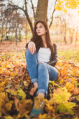 Młoda piękna dziewczyna w fioletowym swetrze leży na jesiennych liściach