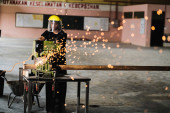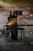 Muadzam Shah, Malezja - 14 października 2020: Młody człowiek przy użyciu frezu do blach, narzędzi dla przemysłu i budownictwa.