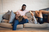 Portret szczęśliwej latynoskiej pary bawiącej się kartonowymi pudełkami w nowym domu w dniu przeprowadzki. Koncepcja nieruchomości.