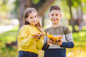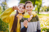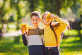 Przyjaźń między rodzeństwem. Rodzeństwo razem na zewnątrz z jasnym kolorowym tłem. Jesienny portret dzieci. Brat i siostra bawią się w jesiennym parku. Rodzinna koncepcja weekendowa aktywna jesień.