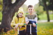 Zdjęcie "Szczęśliwe bliźniaki nastolatek chłopiec i dziewczyna pozowanie przytulanie się w jesiennym parku gospodarstwa spadł żółte liście w ręku w słoneczną pogodę. Temat jesieni. Brat i siostra bawią się liśćmi." może być wykorzystywane do celów osobistych i komercyjnych zgodnie z warunkami zakupionej licencji Royalty-free. Obraz jest dostępny do pobrania w jakości wysokiej rozdzielczości do 5760x3840.