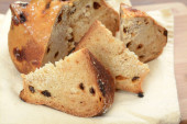 Panettone tradycyjny włoski deser na Boże Narodzenie. Tło drewna. Widok z góry
