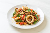 tajskie jedzenie; owoce morza Sukiyaki podawane z pikantnym sosem suki