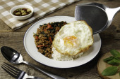Tajskie jedzenie; Bazylia mielona wieprzowina z ryżem i jajkiem smażonym