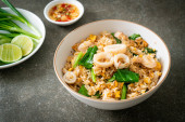 Tajskie jedzenie; smażony makaron z wieprzowiną w sosie sojowym i warzywnym