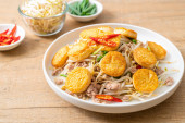 Tajskie jedzenie, makaron instant pikantna sałatka z mieloną wieprzowiną
