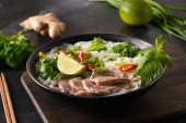 Tajskie jedzenie, makaron instant pikantna sałatka z mieloną wieprzowiną