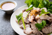 Gotowane ryby z pikantnym sosem zanurzeniowym i warzywami