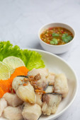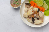 Gotowane ryby z pikantnym sosem zanurzeniowym i warzywami