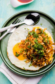 Chrupiący omlet z mieloną wieprzowiną i sosem warzywnym
