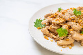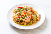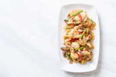 Tajskie jedzenie; smażony makaron z wieprzowiną w sosie sojowym i warzywnym