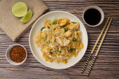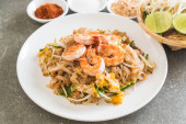 Tajskie jedzenie; smażony makaron z wieprzowiną w sosie sojowym i warzywnym