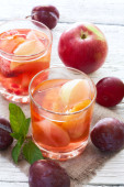 dzbanek i szklankę śliwki umieszczone na drewnianej podłodze
