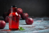 butelka dżemu śliwkowego umieszczona na ciemnej podłodze