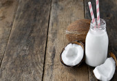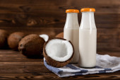 butelka mleka kokosowego umieszczona na drewnianej desce do krojenia