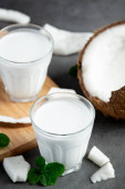 szklankę wody kokosowej na ciemnym drewnianym tle