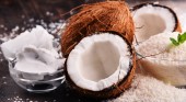 szklankę wody kokosowej na ciemnym drewnianym tle
