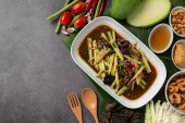 Gotowane ryby z pikantnym sosem zanurzeniowym i warzywami