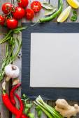 Deska kredowa z surowych warzyw. Przestrzeń kopiowania