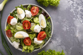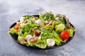 Zdjęcie "sałatka warzywna z pomidorami, serem, rukolą i orzechami włoskimi. Zdrowa i dietetyczna koncepcja żywności. Widok z góry" może być wykorzystywane do celów osobistych i komercyjnych zgodnie z warunkami zakupionej licencji Royalty-free. Obraz jest dostępny do pobrania w jakości wysokiej rozdzielczości do 5760x3840.