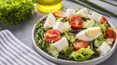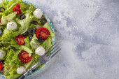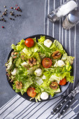 Sałatka warzywna z pomidorami, serem, rukolą i orzechami włoskimi.