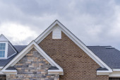 Zdjęcie "Odwrócony podwójny szczyt z bliska na luksusowym domu jednorodzinnym. Kwadratowe pojedyncze okno szczytowe. Linia dachowa tradycyjnego domu z jednym szczytem biegnącym w jedną stronę na odwrócony szczyt biegnący w drugą." może być wykorzystywane do celów osobistych i komercyjnych zgodnie z warunkami zakupionej licencji Royalty-free. Obraz jest dostępny do pobrania w jakości wysokiej rozdzielczości do 5760x3840.