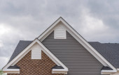 Odwrócony podwójny szczyt z bliska na luksusowym domu jednorodzinnym. Kwadratowe pojedyncze okno szczytowe. Linia dachowa tradycyjnego domu z jednym szczytem biegnącym w jedną stronę na odwrócony szczyt biegnący w drugą.